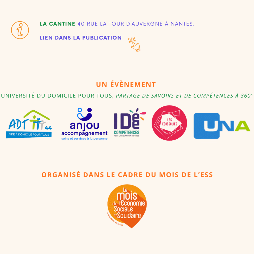 Un évènement Université du Domicile pour Tous, partage de savoirs et de compétences à 360°, avec ADT44, Idée Compétences, Anjou Accompagnement, Les Ecossolies et UNA.