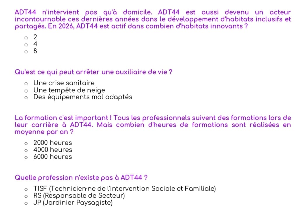 Le 17 mars, journée nationale des aides à domicile, Les professionnelles ont fait remplir le quiz à près de 150 bénéficiaires, de beaux duos de joueuses : intervenantes / personnes aidées ! Bravo et merci pour cette participation.